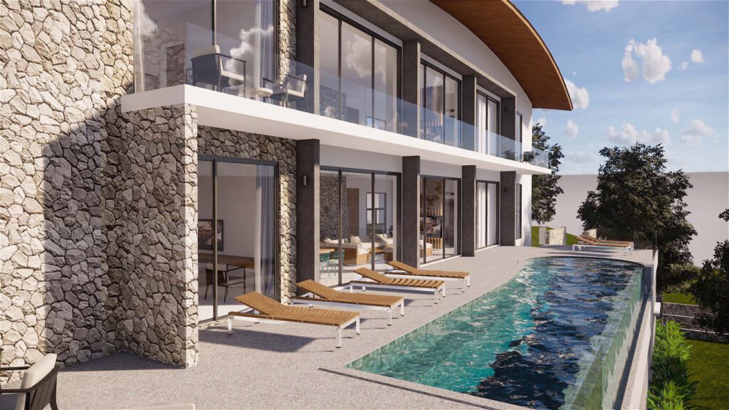 * villa with a rooftop terrace incorporated in the curved shingle roof, an infinity pool-terrace with sun-awning & partially hand-crafted natural stone wall surfaces and a ground floor with multifunctional rooms