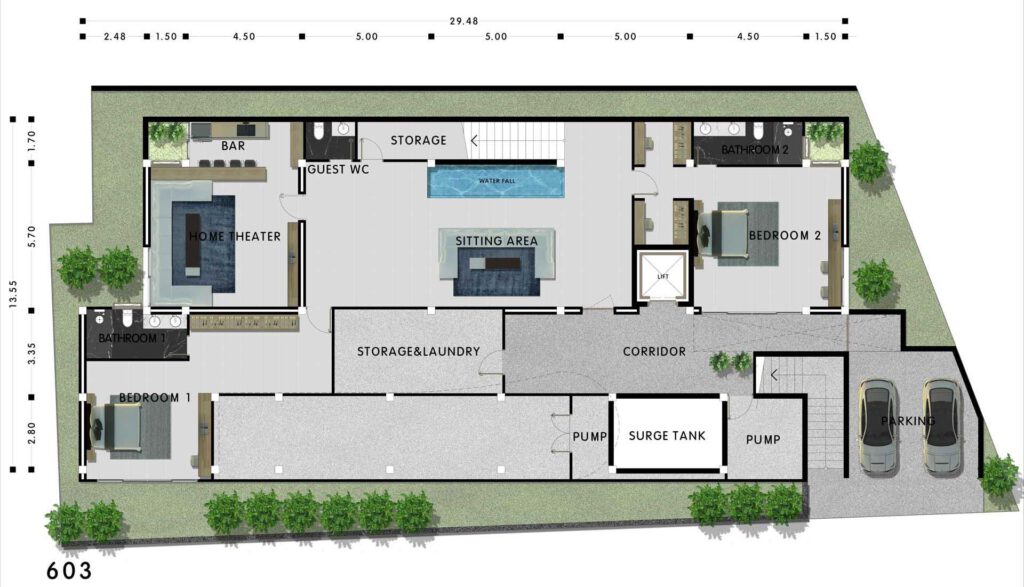 * an indoor waterfall refreshes the living rooms, and an elevator is connecting the basement with the top living floor.