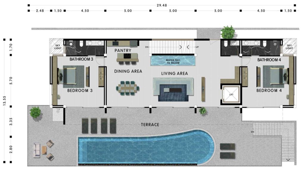 * the second floor relates to the 170 sqm big outdoor deck with the amazing infinity pool and has direct access to the entrance behind the villa.